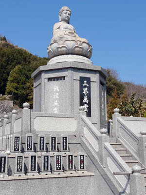 弓削島の中心集落にある自性寺の右手の墓地の中に6柱の御英霊が眠る陸軍軍人墓がある。 またその前には「戦没英霊」と刻まれた大きな三界萬霊塔もある。 三界萬霊塔とは、仏教で有情と呼ばれるこの世の生命あるものすべての霊を宿らせ、 塔を回向することで萬霊を供養することを目的として建立されたものだそうである。 |